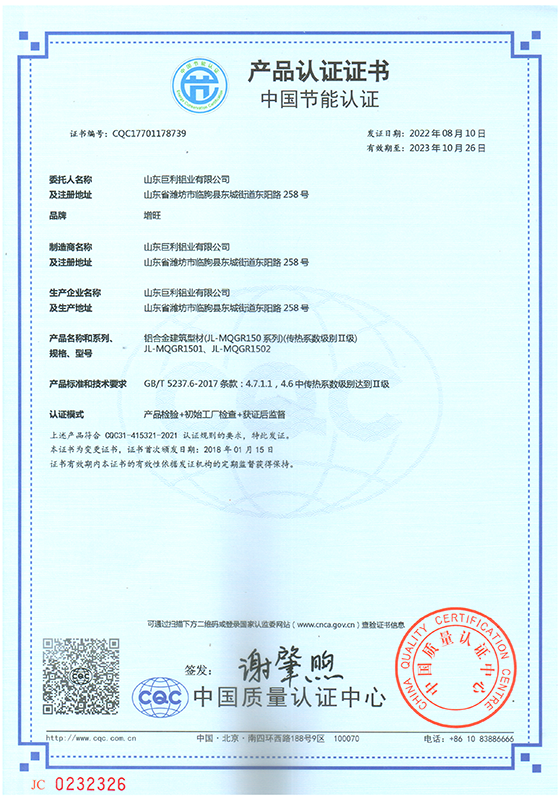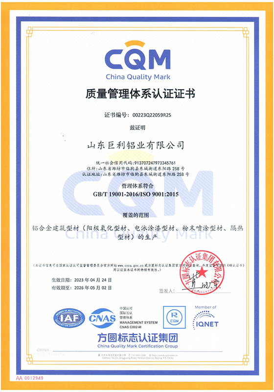 山東巨利鋁業(yè)有限公司是大型專業(yè)化鋁合金門窗、幕墻建筑型材生產企業(yè)。公司座落于中國江北最大鋁合金建筑型材生產、銷售集散地,被稱為“中國鋁業(yè)之都”的臨朐,地處山東半島中部,濰坊市西南部,沂山北麓,公司西臨彌河,東靠長深高速,北接濟青高速,地理位置優(yōu)越,交通十分便利。公司占地總面積18.5萬平方米,擁有國際先進水平的擠壓、陽極氧化、電泳涂漆、粉末噴涂、氟碳噴涂、木紋轉印、隔熱斷橋等系列生產線,年生產節(jié)能環(huán)保鋁型材7萬噸。公司先后通過IS09001質量管理體系認證、ISO14001環(huán)境管理體系認證、0HSAS45001職業(yè)健康安全管理體系認證、IATF16949汽車行業(yè)質量管理體系認證和中國綠色建材產品認證。公司先后榮獲山東省專精特新中小企業(yè)、山東省高新技術企業(yè)、山東省科技型中小企業(yè)榮譽稱號。“客戶的滿意,巨利的追求”。不斷的改進和完善質量管理,不斷的提高售后服務水平,持續(xù)向客戶提供一流的產品和一流的服務,是我們巨利人孜孜以求的永恒目標,我們愿與廣大業(yè)務同仁共同努力,共創(chuàng)雙贏,不斷發(fā)展,走向更加輝煌的明天。